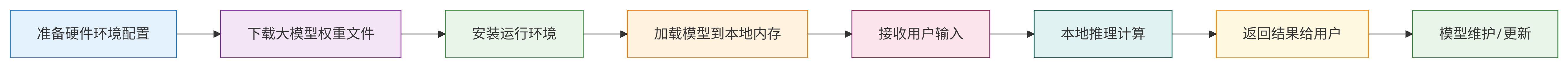 本地部署的核心,就是把 “输入→推理→输出” 的全过程,都放在自己的硬件设备上完成。下面是详细的执行流程,我们用流程图直观展示,再逐步拆解。