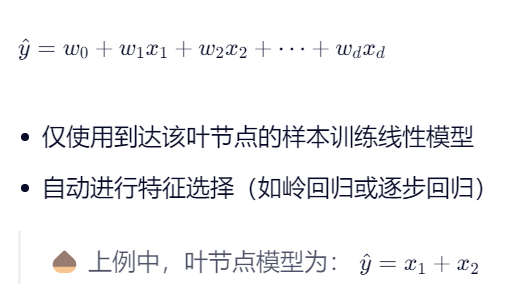 叶节点预测 | 样本均值(常数) | 多元线性回归模型 |