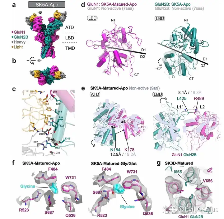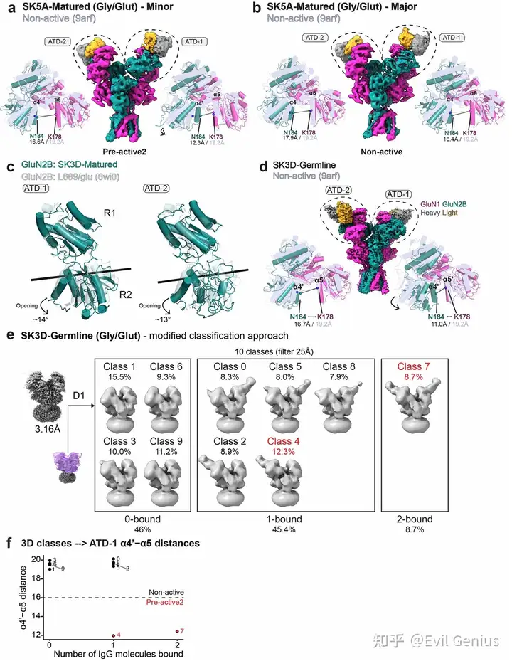 通过电生理和冷冻电镜结构分析,系统揭示了肿瘤来源的抗NMDAR抗体对通道功能的不同调节作用及其结构基础。研究者首先利用抗体结合后的NMDAR结构,测量了反映受体构象状态的关键距离参数(α4′–α5和L1′–L2),发现SK3D成熟抗体和SK5A成熟抗体结合的受体呈现一种此前未被报道的构象状态(命名为pre-active2),其特征是仅ATD-1异源二聚体中的α4′–α5距离缩短,而LBD区域的L1′–L2距离保持不变。进一步分析显示,SK3D种系抗体结合的受体中仅约21%呈现pre-active2构象,而成熟抗体结合后该构象比例显著增加,表明亲和力成熟与受体调节能力相关。SK5A成熟抗体的结合不依赖激动剂,在无甘氨酸和谷氨酸条件下仍能结合相同的表位残基,并稳定受体于gly/apo状态。通过对所有抗体-NMDAR复合物的构象进行分类,研究者将受体状态分为gly/apo、pre-active、open、pre-active2和non-active五种类型。基于构象特征,研究者准确预测了各抗体的功能效应:SK3D成熟抗体和SK5A成熟抗体呈剂量依赖性增强NMDAR通道电流(333 nM时增强超过200%),SK5G成熟抗体则抑制通道活性,而SK5B成熟抗体仅有微弱增强作用(333 nM时小于20%),非结合对照抗体无任何效应。在体外细胞毒性实验中,具有通道增强作用的SK3D抗体表现出剂量依赖的细胞毒性(IC50为120 nM),而抑制性抗体SK5G则具有保护作用。在B细胞缺陷小鼠的4T1-NMDAR肿瘤模型中,SK3D抗体治疗显著增强了肿瘤消退,其中2/4的肿瘤达到接近完全病理缓解,肿瘤组织中上皮特异性转录本几乎检测不到,而免疫相关转录本显著富集。重要的是,抗体对通道电流的功能调节效应与α4′–α5距离呈高度相关(r²=0.98,P=0.0059),证实冷冻电镜结构分析对预测自身抗体功能效应具有直接指导意义。这些结果共同表明,肿瘤来源的抗NMDAR抗体可产生从强抑制到强增强的完整功能调节谱系,其效应可通过结构分析准确预测。