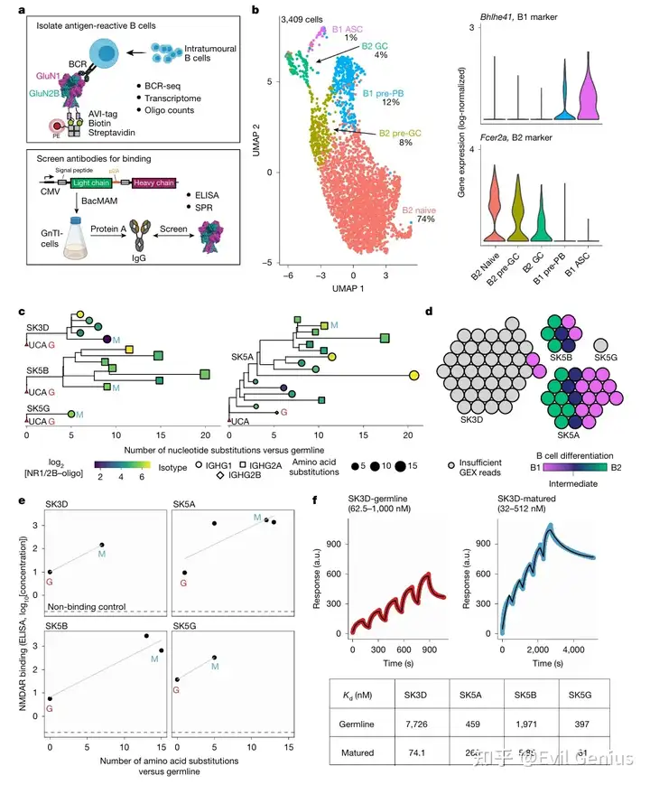 研究通过对4T1-NMDAR肿瘤模型中NMDAR结合B细胞的分析,揭示了抗NMDAR抗体起源于种系构型幼稚B细胞。研究人员从抗体滴度升高的小鼠肿瘤内分选并测序了3,180个NMDAR结合B细胞,鉴定出从幼稚到抗体分泌细胞的一系列分化状态,其中所有前浆母细胞和抗体分泌细胞均表现为Bhlhe41高表达和Fcer2a低表达。通过构建BCR系统发育树,筛选出四个具有NMDAR结合能力的克隆型,每个克隆型均包含种系序列和经过体细胞高频突变的成熟序列,其中SK5A克隆型发生了多达四次的类别转换事件。重组表达和ELISA实验证实,所有四个克隆型的种系抗体和成熟抗体均能特异性结合GluN1-GluN2B,而不结合BSA或多反应性抗体常见靶标。表面等离子体共振(SPR)分析进一步显示,种系抗体对NMDAR的结合亲和力较低(Kd范围为397–7,726 nM),而成熟抗体的亲和力显著提高(Kd范围为5.85–263 nM),证实了亲和力成熟过程。此外,对肿瘤引流淋巴结来源B细胞的分析发现,具有NMDAR结合能力的细胞主要是未突变的幼稚B细胞,且从中筛选出两种未突变抗体同样具有NMDAR结合能力。这些结果共同证明,NMDAR反应性B细胞来源于天然存在的种系构型幼稚B细胞,这些细胞在肿瘤内经历体细胞高频突变和类别转换后,发育为高亲和力的成熟抗体。
