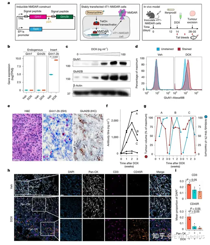 通过建立多西环素诱导表达GluN1-GluN2B的4T1小鼠三阴性乳腺癌模型,发现癌细胞中异位表达的NMDAR亚基(GRIN1和GRIN2B)具有高度免疫原性。单细胞RNA测序显示,高表达Grin1-2b的癌细胞cluster增殖标志物上调,同时肿瘤浸润中性粒细胞表达xCT,可能参与旁分泌信号。诱导NMDAR表达后,小鼠体内抗NMDAR抗体滴度在两周内达峰,高滴度个体出现肿瘤自发消退;肿瘤组织表现为B细胞、T细胞和巨噬细胞富集,并形成三级淋巴结构。这些结果表明,肿瘤细胞中异位表达的NMDAR足以诱导强大的适应性免疫应答,尤其是抗NMDAR体液免疫。