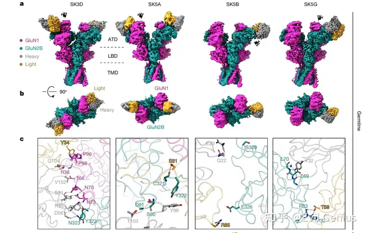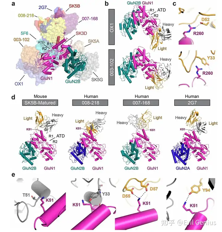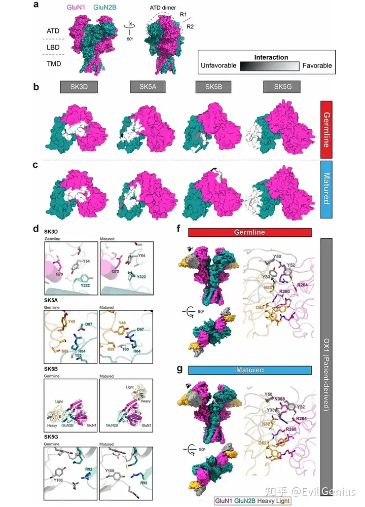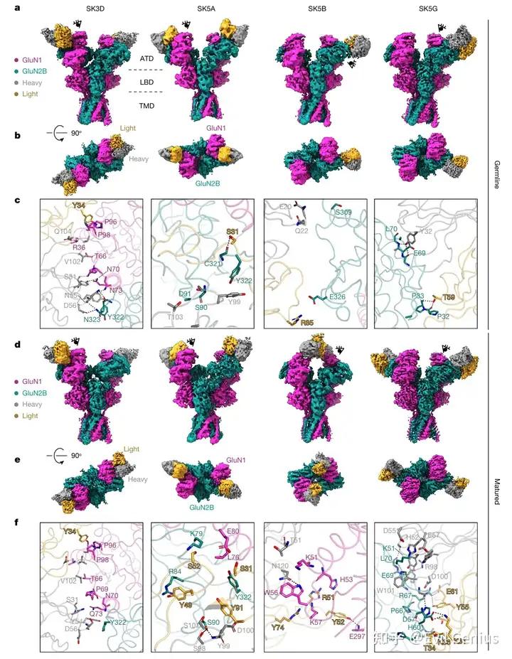 为了探究肿瘤来源的抗NMDAR抗体的表位特征,对四个小鼠肿瘤来源克隆型的代表性种系抗体和成熟抗体与GluN1-GluN2B复合物进行了冷冻电镜结构解析。所有抗体均结合于NMDAR的氨基末端结构域(ATD),表位均匀分布于GluN1和GluN2B亚基之间。其中SK3D和SK5A两种成熟抗体结合于GluN1-GluN2B ATD R1叶的界面区域。结构分析显示,亲和力成熟伴随着抗体-抗原相互作用的增强:在SK3D克隆型中,成熟抗体通过GluN1 Gln73、GluN2B Tyr322与重链CDR2区域Tyr54的协同配位实现亲和力提升;在SK5B克隆型中,种系抗体仅与GluN2B ATD R1叶存在微弱静电相互作用,而成熟抗体则转向结合GluN1 ATD的氨基末端,发生了表位扩散现象;在SK5G克隆型中,成熟抗体通过重链CDR3区域Tyr108与GluN2B Arg92的增强配位提高了亲和力。此外,研究者还从ANRE患者OX1中分离出相关IgG1 B细胞,其成熟抗体(OX1-matured)的Fab片段与NMDAR结合的Kd为83.7 nM,冷冻电镜分析显示OX1成熟抗体和种系抗体均结合于GluN1 ATD的R2叶重叠表位。通过与已报道的患者来源抗体结构比较,发现多个抗体表位存在明显收敛:OX1与003-102抗体均与GluN1 Arg260形成极性相互作用;SK5B成熟抗体在GluN1 ATD R1叶的表位与008-218、007-168和2G7三种患者来源抗体直接重叠,其中高度暴露的GluN1 Lys51构成免疫优势表位的一部分;SK5A和SK3D则结合于GluN1-GluN2B亚基界面,与部分患者来源抗体选择性识别异源二聚体的特征一致。这些发现揭示了肿瘤来源抗体在克隆型内部和克隆型之间表位的多样性,并证明了跨物种的表位收敛于GluN1-GluN2B ATD区域。