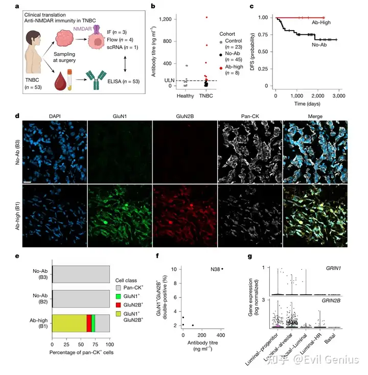 分析了53例三阴性乳腺癌(TNBC)患者的血浆样本,发现其中8例(15%)患者的抗NMDAR抗体滴度超过正常值上限(95%置信区间)。在中位4.29年的随访期内,这些抗体高滴度患者均未出现疾病进展。通过免疫荧光和流式细胞术检测,在抗体高滴度患者的肿瘤组织中可检测到上皮来源的GluN1-GluN2B表达,而抗体阴性患者则未检测到。流式细胞术进一步显示,不同患者的GluN1-GluN2B双阳性细胞比例存在差异,其中抗体滴度最高的患者(N38,滴度416 ng/ml)呈现最高的阳性细胞比例。对该患者肿瘤组织的单细胞RNA测序分析显示,GRIN1和GRIN2B主要表达于缺乏ESR1表达的管腔祖细胞样(KIT+KRT23+)和管腔肺泡样(ELF5+)癌细胞亚群;同时在T细胞组分中观察到与三级淋巴结构形成及良好预后相关的细胞毒性CD8+ T细胞和滤泡辅助性T细胞样CD4+ T细胞(CXCL13+IGFL2+)。这些结果揭示了肿瘤内源性NMDAR表达与循环抗NMDAR抗体之间的强相关性,支持抗NMDAR免疫应答抑制TNBC肿瘤生长的模型。