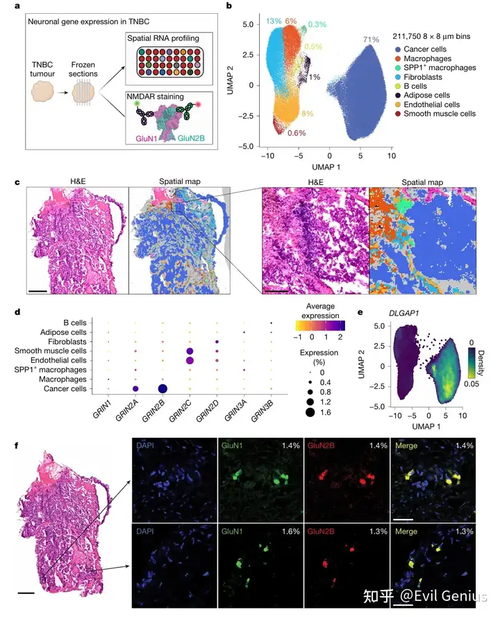 通过对METABRIC和TCGA数据库(bulk)的再分析,研究确认部分乳腺癌同时表达GRIN1和GRIN2B,其中GRIN1在雌激素受体阳性肿瘤中高表达,而GRIN2B在TNBC中显著富集。进一步对TNBC切片进行空间RNA(visium HD)分析发现,GRIN2B转录本仅存在于癌细胞cluster中,且癌细胞也表达NMDAR支架蛋白GKAP。免疫荧光分析最终在1-2%的肿瘤细胞中验证了GluN1和GluN2B蛋白的表达。