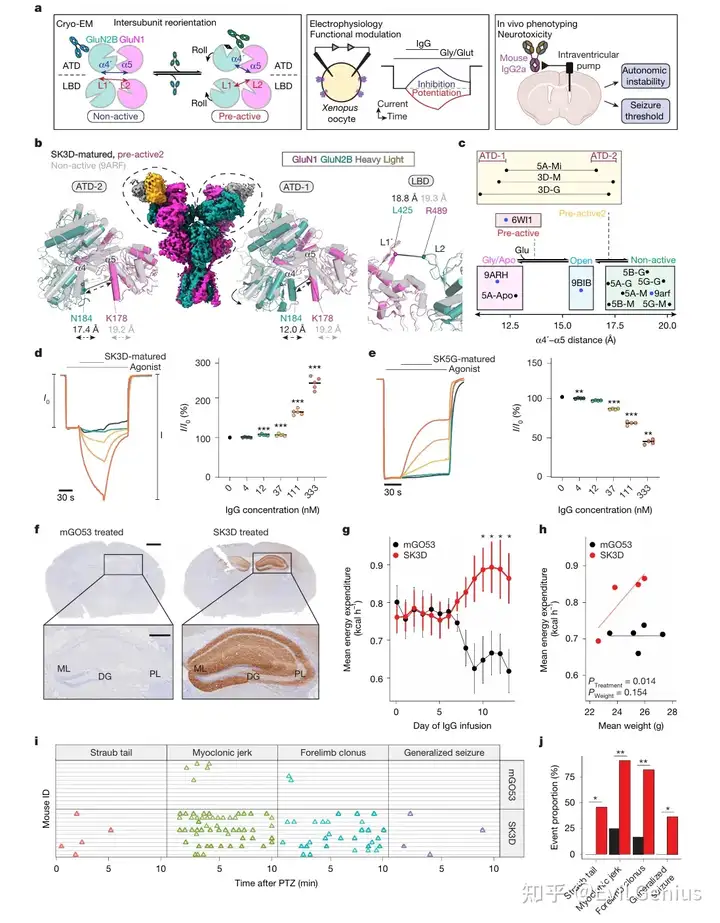 这些结果表明,SK3D成熟抗体(其种系构型B细胞受体保留NMDAR结合能力)的脑室内输注,足以复制ANRE患者常见的自主神经调节障碍和癫痫发作阈值降低两大核心特征,而通道抑制型抗体SK5G则不产生这些表型。这直接证明了种系编码抗体与ANRE发病之间的因果关系。