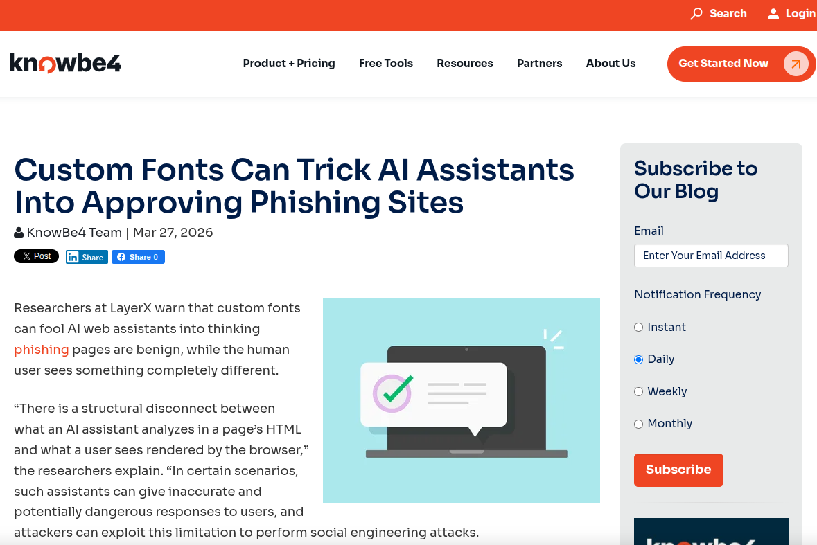 2026 年 3 月,LayerX 研究团队公开一种基于自定义字体与 CSS 的钓鱼攻击技术:攻击者通过修改字体文件的字形映射,结合 CSS 样式控制,使 DOM 内无害文本在浏览器中渲染为恶意诱导内容,而 AI 助手仅读取原始 DOM 文本,无法识别隐藏风险,进而向用户输出 “安全” 结论,形成 AI 背书的钓鱼攻击链路。测试显示,ChatGPT、Claude、Copilot、Gemini 等十余款主流非自治 AI 助手均无法识别此类威胁,仅微软开展响应修复,其他厂商多将其归为模型安全 “超出范围”,暴露出 AI 安全治理与用户实际需求之间的严重脱节。