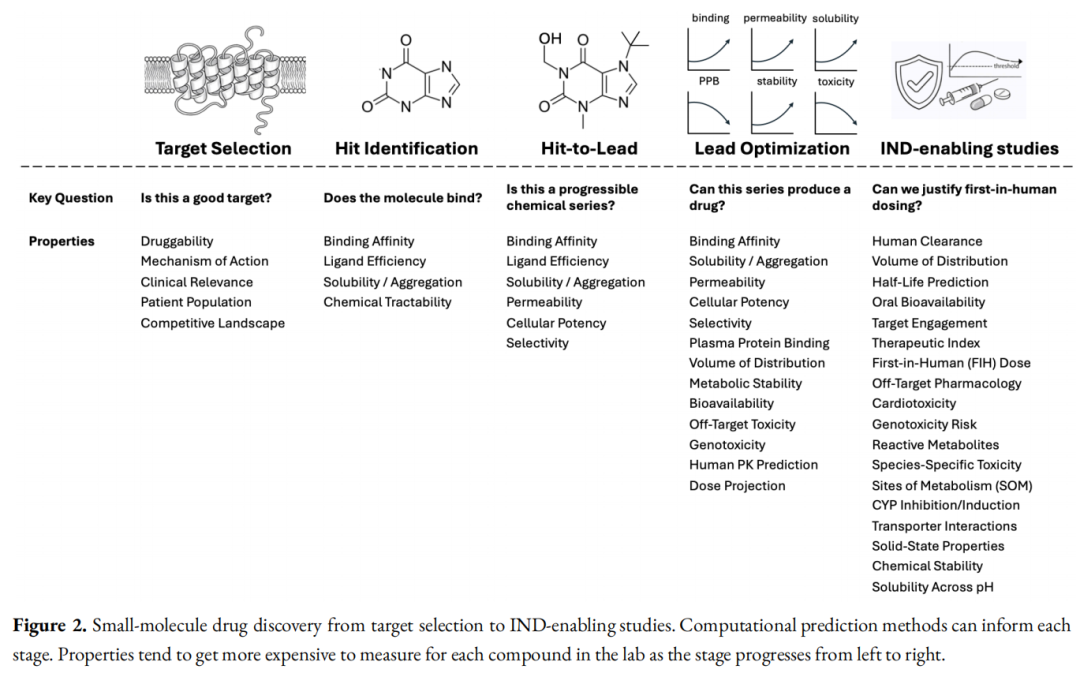 评估指标 → 可量化的进展标准(而非"更好了"的定性判断)论文聚焦于小分子药物发现的 Discovery 阶段,即从靶点确定到 IND 候选物提名,覆盖:靶点选择 → 苗头化合物发现 → 苗头到先导 → 先导优化 → IND 前研究。不涉及临床试验、商业化及生物制剂等模态。
