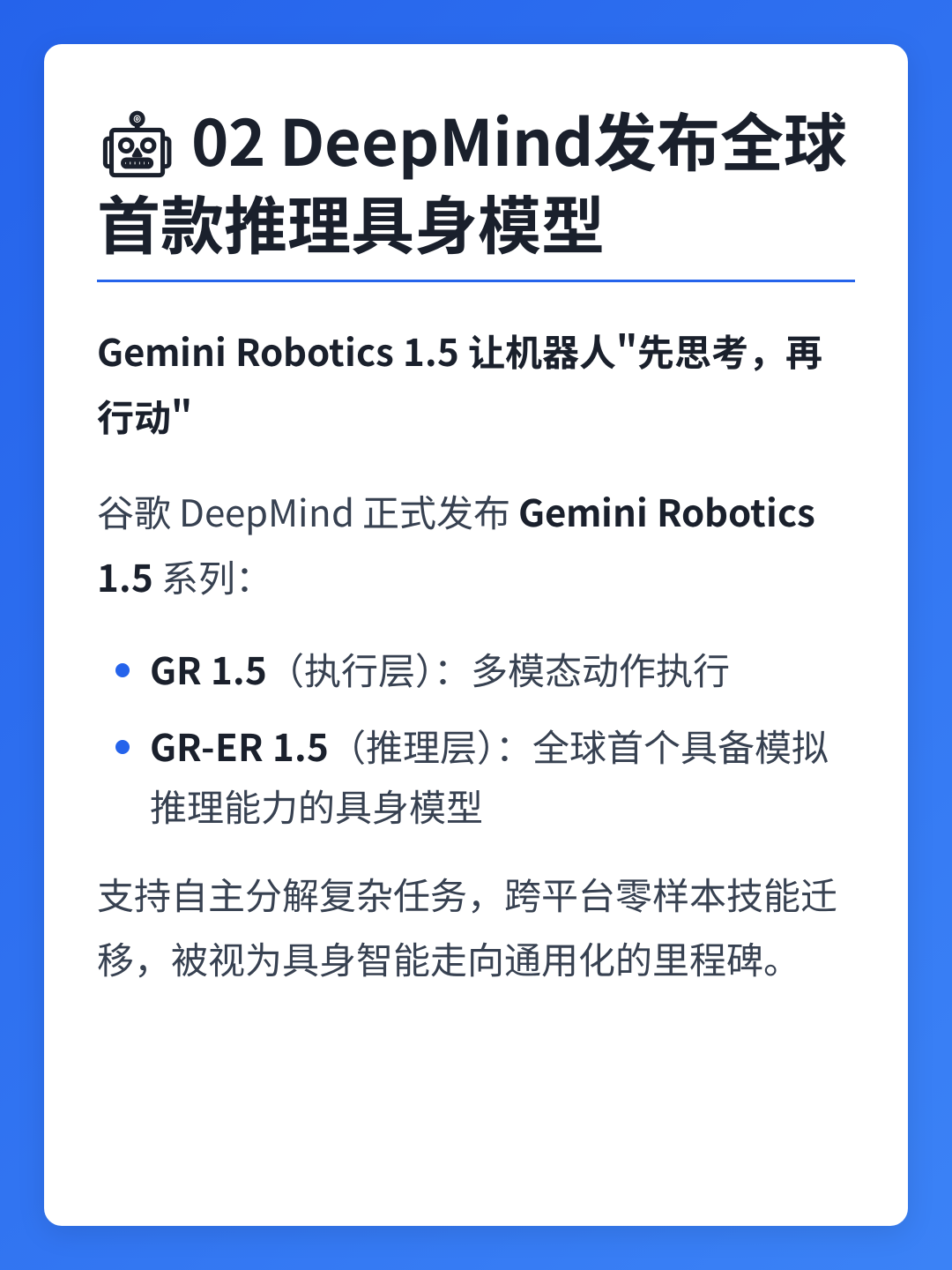 02机器人进展🤖 DeepMind发布全球首款推理具身模型 Gemini Robotics 1.5