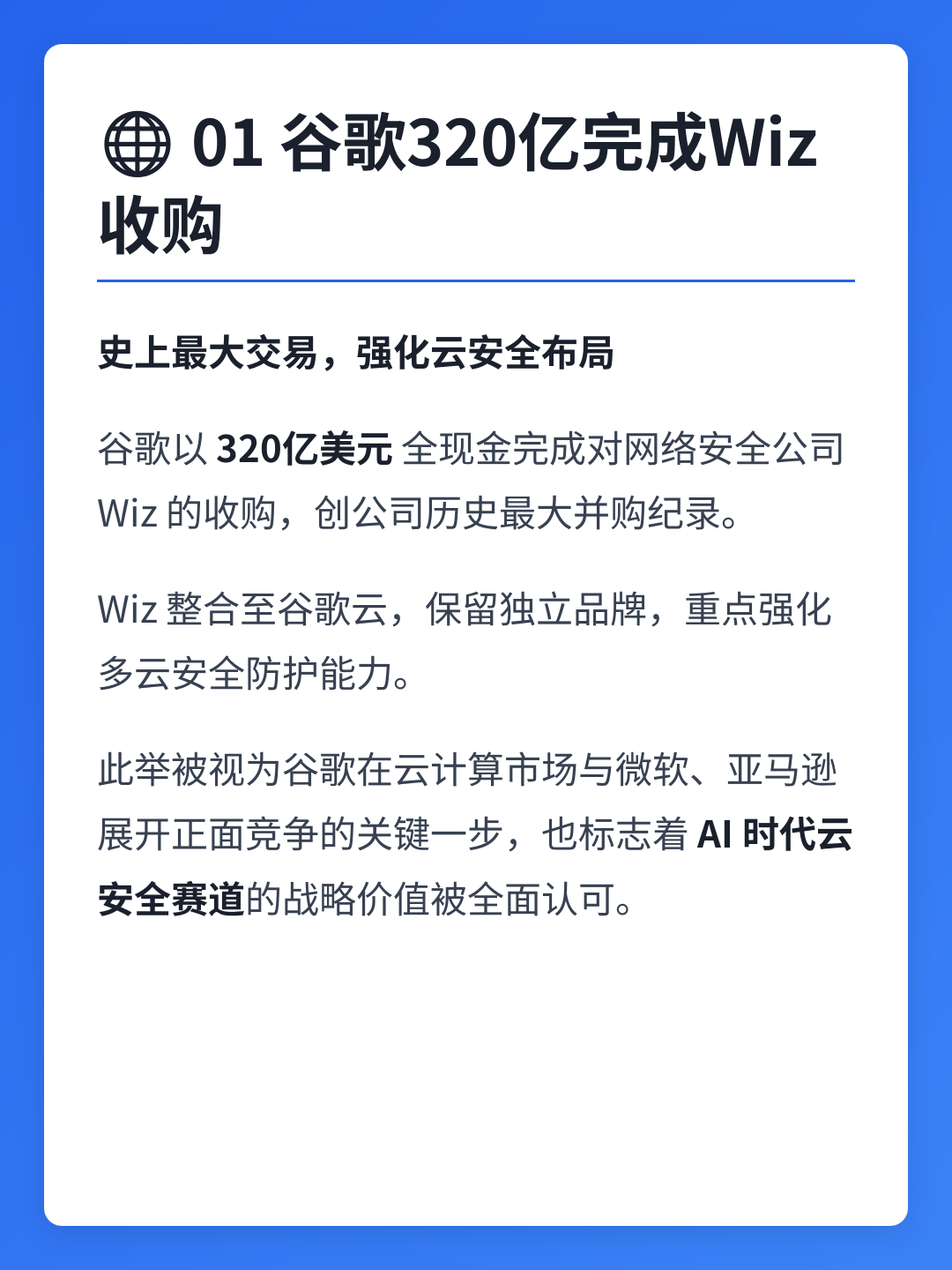 01云计算🌐 谷歌320亿完成Wiz收购,史上最大交易强化云安全布局