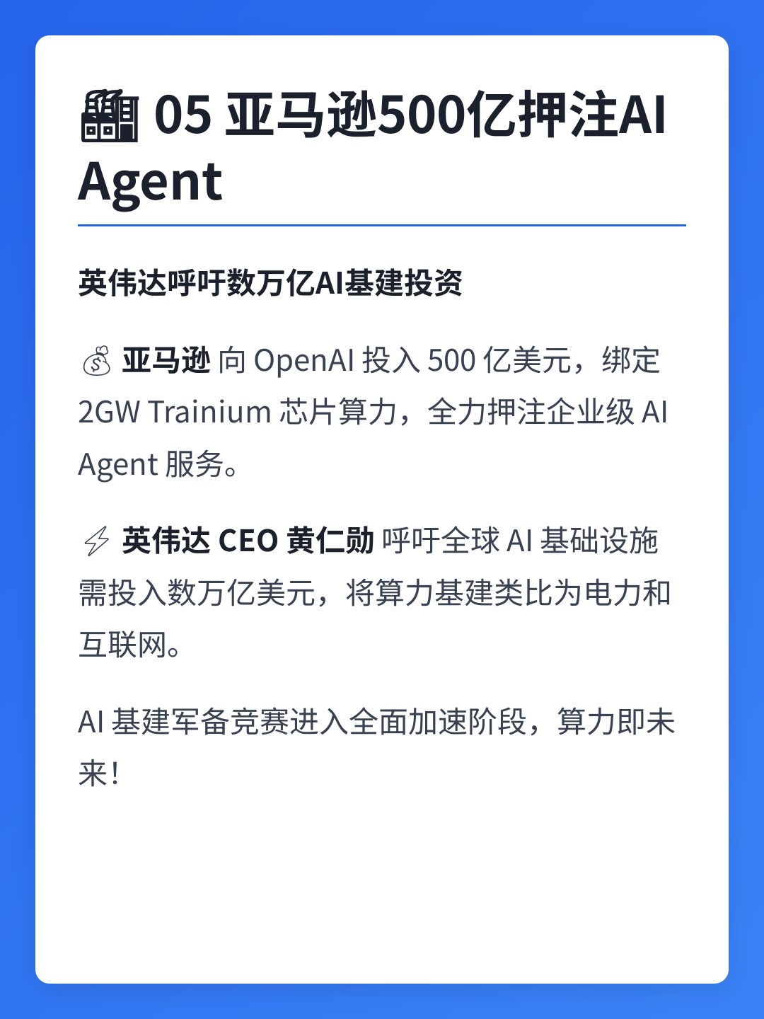 05融资动态🏭 亚马逊500亿押注AI Agent,英伟达呼吁数万亿美元AI基建投资
