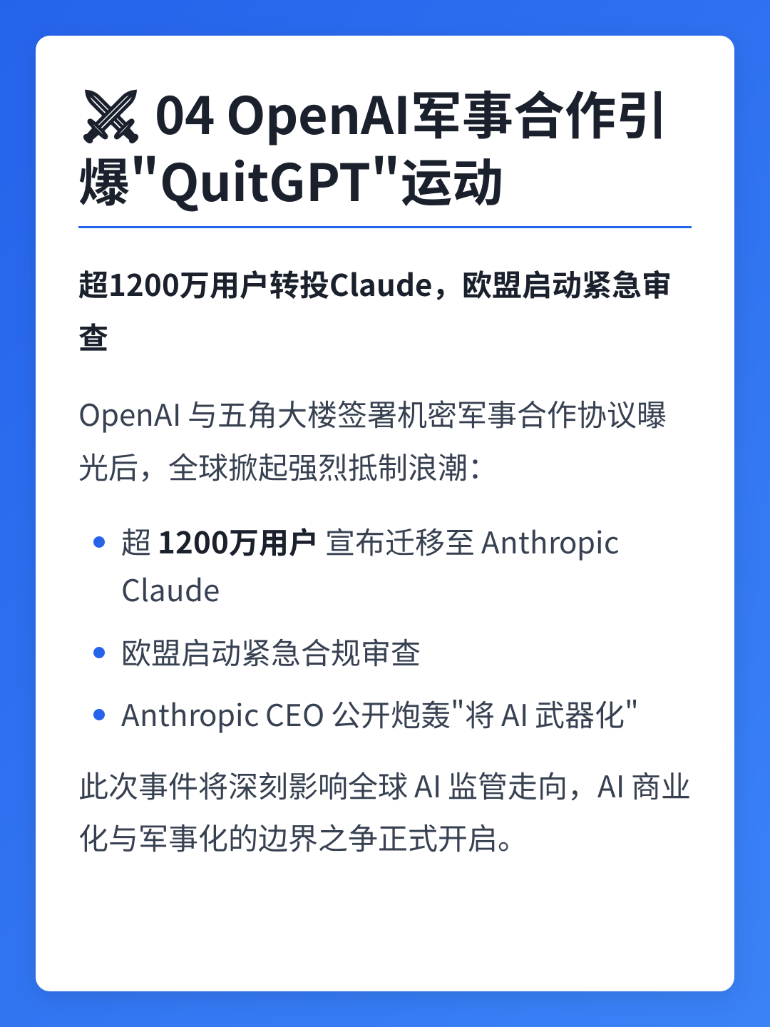 OpenAI 与美国五角大楼签署机密军事合作协议一事曝光后,在全球范围内引发强烈抵制。超过 1200万用户宣布迁移至 Anthropic 的 Claude,欧盟随即启动紧急合规审查。Anthropic CEO 公开炮轰此举「将 AI 武器化」,凸显 AI 伦理治理的深层分歧。此次事件被视为 AI 商业化与军事化边界的标志性冲突,将深刻影响全球 AI 监管走向。