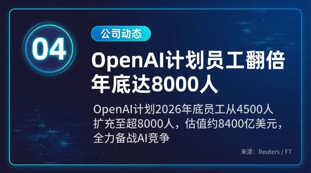 据《金融时报》报道,OpenAI计划在2026年底前将员工规模从约4500人扩充至超过8000人,实现近乎翻倍的增长。此次大规模扩招计划意在加速技术创新并巩固其在全球AI领域的领导地位,发生在公司估值约达8400亿美元的背景下。