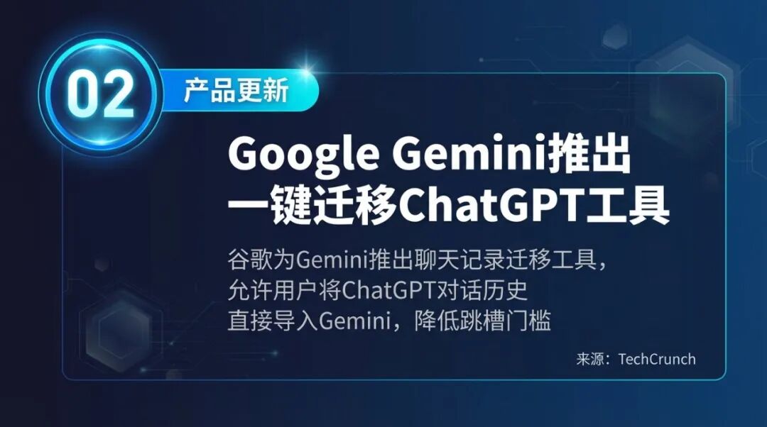 谷歌正式为Gemini推出聊天记录迁移工具,允许用户将ChatGPT及其他聊天机器人的对话历史和个人信息直接导入Gemini。尽管ChatGPT已拥有9亿周活跃用户,谷歌此举旨在通过降低迁移门槛,加速抢占ChatGPT的用户群体。目前该功能已正式上线。