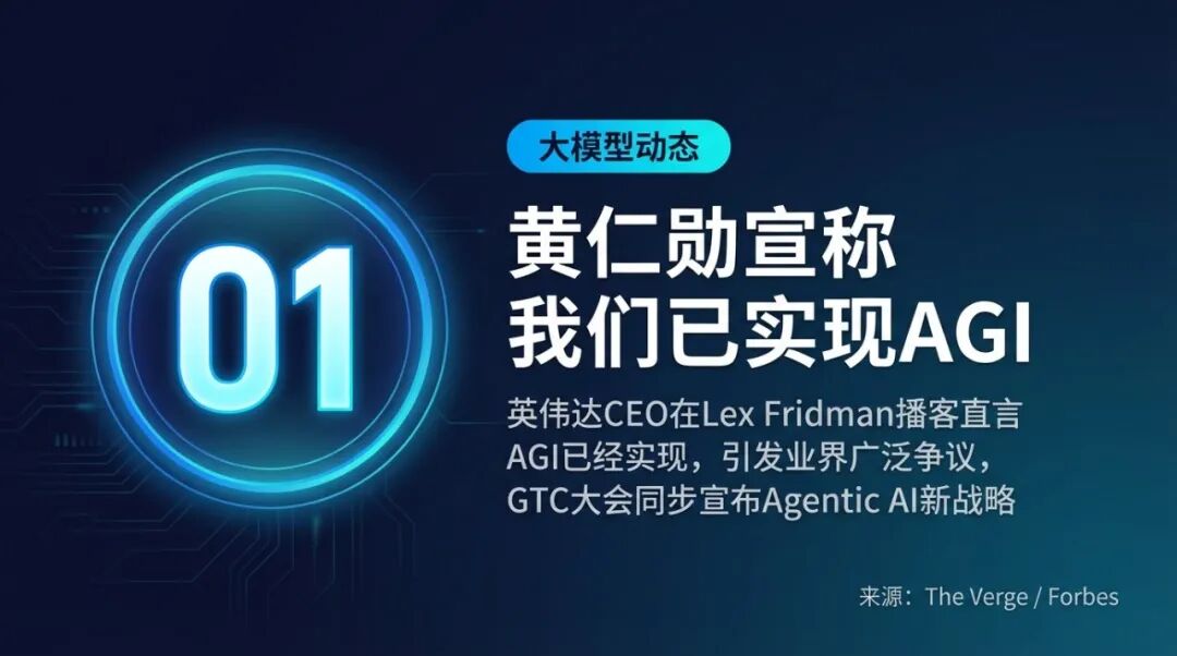 英伟达CEO黄仁勋在Lex Fridman播客中语出惊人,直接宣称AGI已经实现,将AGI定义为能独立运营价值超十亿美元科技公司的AI系统。此言论迅速引发业界广泛争议,批评者认为其例子恰恰说明AI与真正AGI之间仍存在巨大鸿沟。GTC 2026大会上黄仁勋同步宣布,Agentic AI将重塑英伟达整体战略。