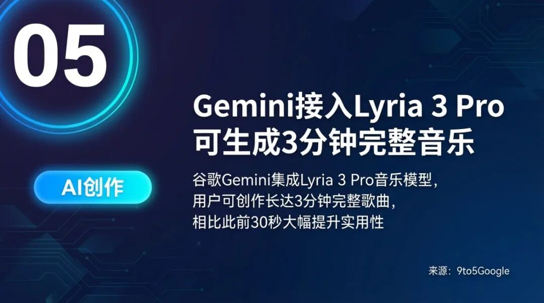 谷歌宣布Gemini应用正式集成Lyria 3 Pro音乐生成模型,用户现在可以通过Gemini创作长达3分钟的完整歌曲。此前Gemini仅支持通过Lyria 3生成30秒短曲,此次升级大幅提升了AI音乐创作的实用性,用户只需输入文字描述即可生成高质量音乐作品。