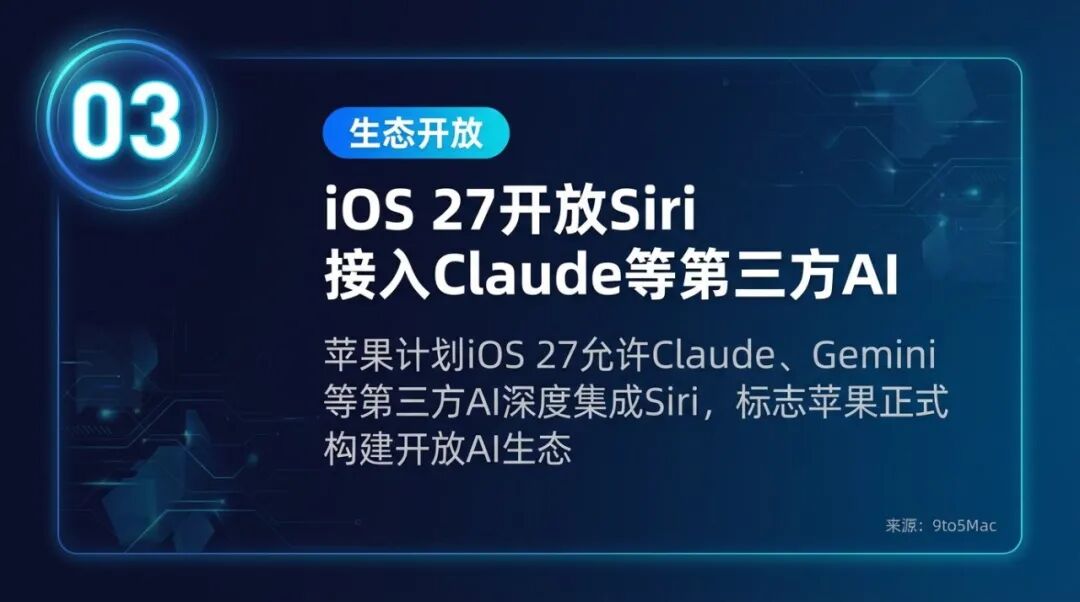 据报道,苹果计划在iOS 27中允许Claude、Gemini等第三方AI聊天机器人应用深度集成到Siri。不仅与谷歌达成使用Gemini模型的协议,还将进一步向Anthropic的Claude等AI开放接口,标志着苹果正式构建开放的AI生态系统。