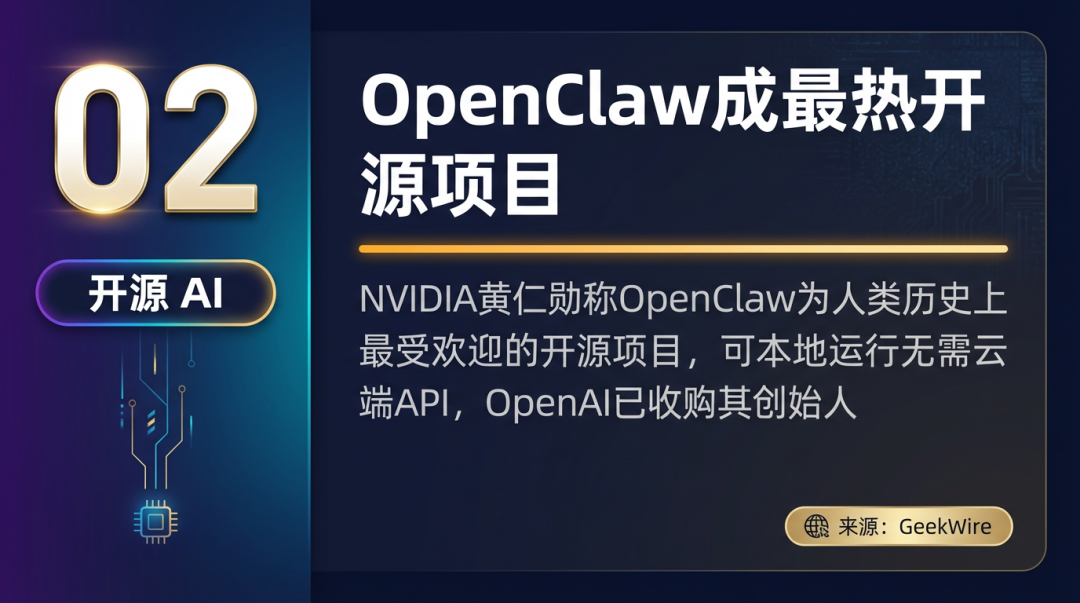 由奥地利独立开发者 Peter Steinberger 构建的开源 AI Agent 框架 OpenClaw,被 NVIDIA CEO 黄仁勋称为人类历史上最受欢迎的开源项目。OpenClaw 可在本地运行无需云端 API,彻底颠覆 AI Agent 市场格局,OpenAI 已宣布收购其创始人。