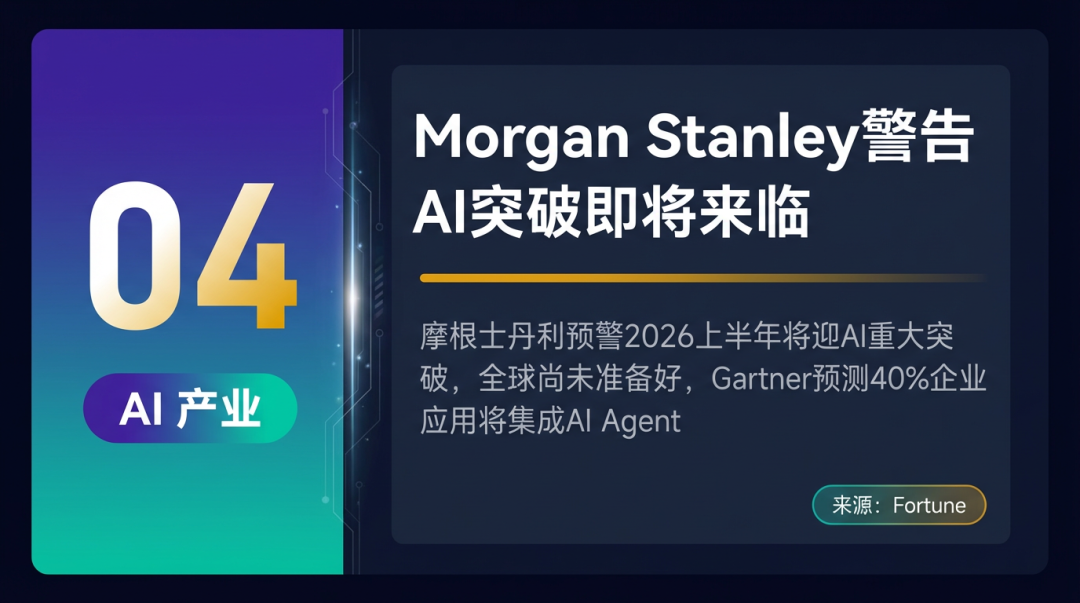 摩根士丹利发出重磅预警:2026 年上半年将迎来 AI 领域的重大突破,但全球大多数企业和政府尚未做好准备。AI 正从生成式快速转向 Agentic AI,Gartner 预测到 2026 年底 40% 的企业应用将集成任务专用 AI Agent。