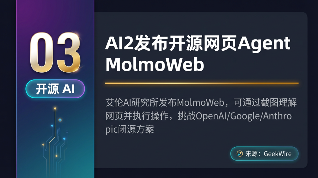 艾伦人工智能研究所发布开源网页 Agent MolmoWeb,基于 Molmo 2 多模态模型,可通过截图理解网页并执行点击、输入、滚动等操作,让开发者能完整了解 Agent 内部机制,与 OpenAI、Google、Anthropic 的闭源方案形成竞争。
