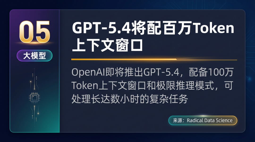 OpenAI 即将推出的 GPT-5.4 模型将配备高达 100 万 Token 的上下文窗口,并引入极限思考模式,允许在复杂问题上消耗更多算力以提升准确性,特别适合长达数小时的复杂任务。目前 OpenAI 已通过 API 提供 85 个活跃模型。