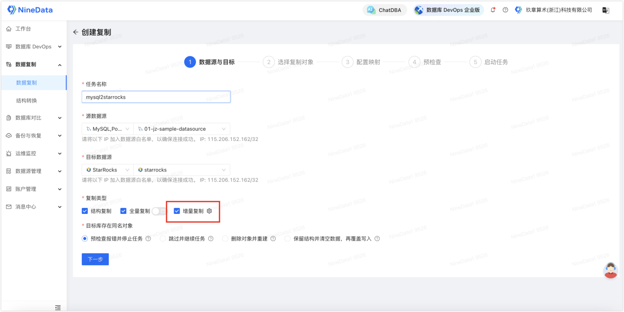 NineData 的结构复制能自动完成目标端建表和字段映射,这对 PoC、ODS 承接、批量接入小表比较省力。再配合同名对象处理策略,初始化成本会低不少。
