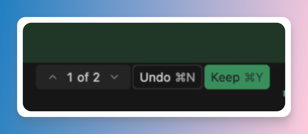 改完代码那个 diff 预览是真的好用。 绿的加红的删,一目了然。更爽的是,如果某一块改动你不认可,可以只针对那部分 undo,其他的保留。Claude Code 做不到这种颗粒度,它改完你要么接受要么用 git 回滚,没有中间状态。