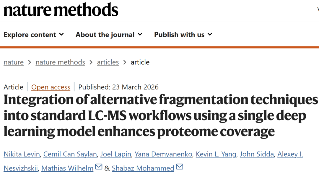 Levin, N., Saylan, C.C., Lapin, J. et al. Integration of alternative fragmentation techniques into standard LC-MS workflows using a single deep learning model enhances proteome coverage. Nat Methods (2026).