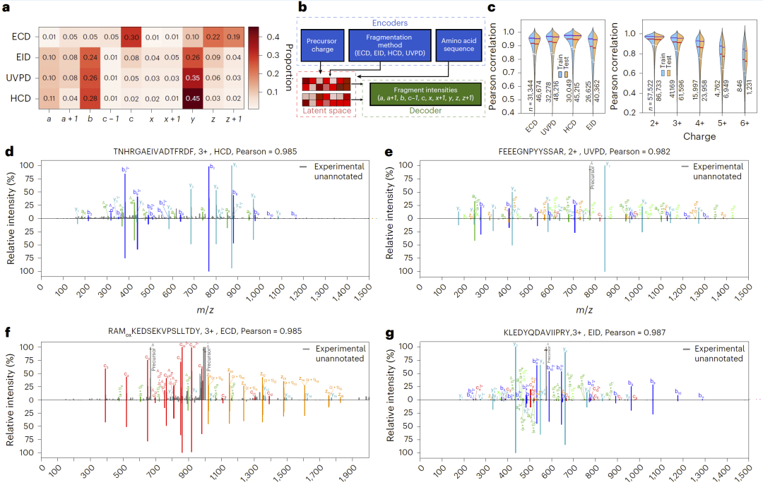 然而,在实际工作流程中,将多种碎裂技术整合到同一次实验中仍然具有挑战。一方面,不同碎裂方式产生的谱图特征差异较大,使数据库搜索难以统一处理;另一方面,建立针对每种碎裂方式的预测模型需要大量数据,并增加计算复杂度。