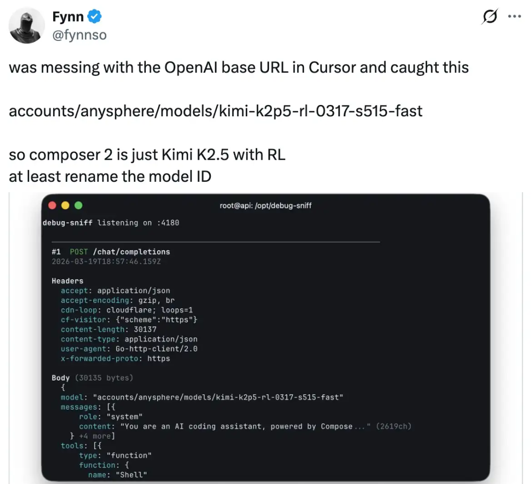 热闹之下,很快就有开发者在接口调试时发现了猫腻。Composer 2的模型名里,出现了“Kimi-k2p5”这样的字段。