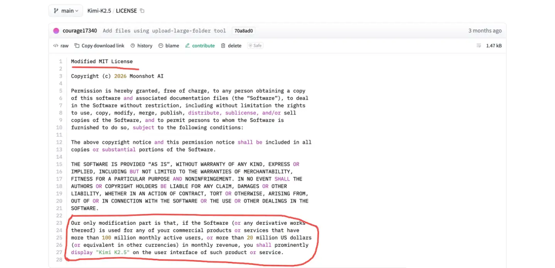 Kimi K2.5虽然是“开源”,用的是经过改写的MIT协议:只要你的业务月活超1亿、营收超2000万美元,就得在UI里“显眼”地标明是基于Kimi K2.5开发。
