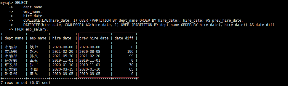 LAG(hire_date, 1) OVER (PARTITION BY dept_name ORDER BY hire_date) AS prev_hire_date,