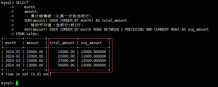 SUM(amount) OVER (ORDER BY month) AS total_amount,