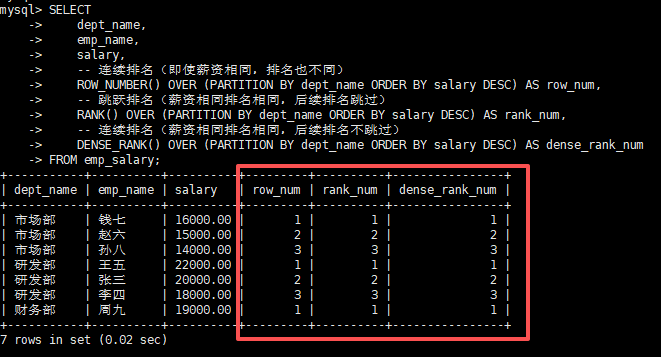 需求:给每个部门的员工按薪资从高到低排名,区分3种排名函数的差异。