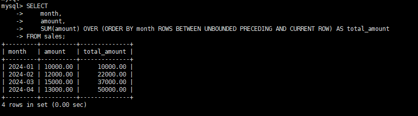 SUM(amount) OVER (ORDER BY month ROWS BETWEEN UNBOUNDED PRECEDING AND CURRENT ROW) AS total_amount
