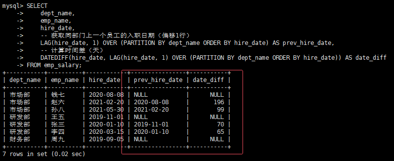 需求:计算每个员工入职时间与同部门上一个员工的入职时间差(环比分析常用)。