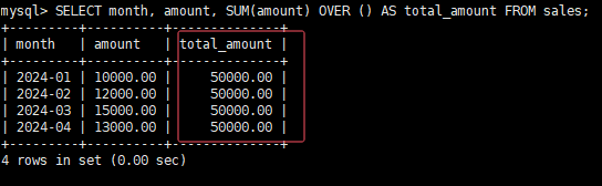 SELECT month, amount, SUM(amount) OVER () AS total_amount FROM sales;