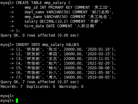 先创建一张业务表(员工薪资表),后续案例均基于此表: