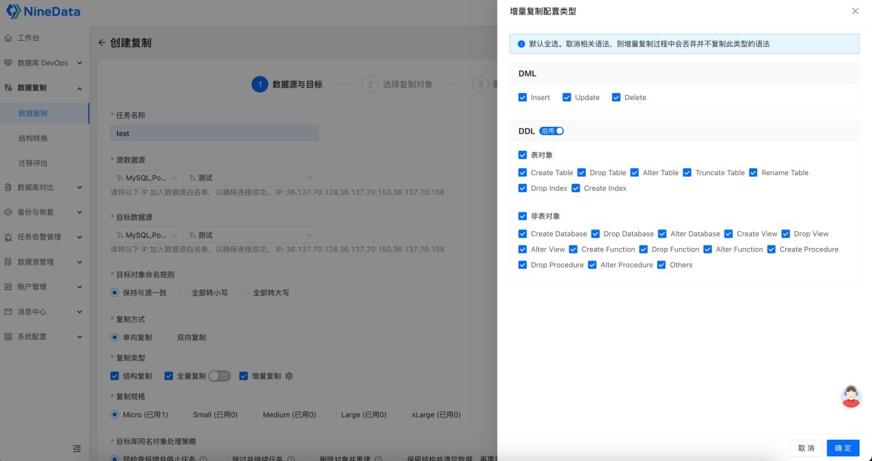如果每接一个新库、一个新表都要写脚本、改配置、反复试跑,这条链路从一开始就不够经济。NineData 在 MySQL→SelectDB 的实践里给出的思路很直接:图形化配置,支持快速创建同步任务,把接入门槛降到可复制的程度。
