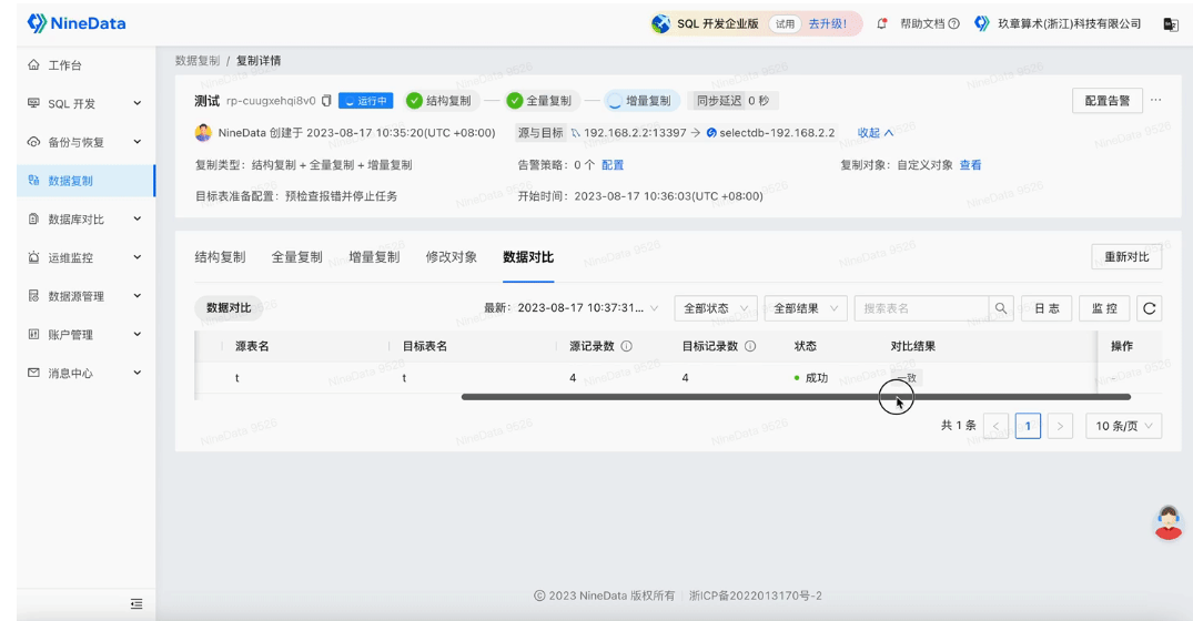 NineData 在这个场景里的价值,不只是提供了一条复制通道,而是把任务创建、实时复制、结构联动、数据对比、告警监控和运维调整放进了同一套体系里。这样一来,技术团队面对的就不再是一个黑盒脚本,而是一条透明、可控、可验证的实时数据链路。