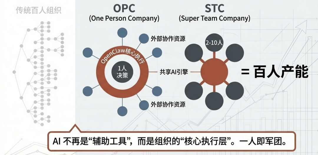 而 OPC ,全称 One Person Company (一人公司),是AI时代“超级个体”创业模式:一人决策, OpenClaw 等AI工具执行,借助外部资源协作,就能完成传统十多人团队的工作。类似的有 STC (Super Team Company,超级团队公司),则是2–10人小型团队,靠AI实现高人均产出。