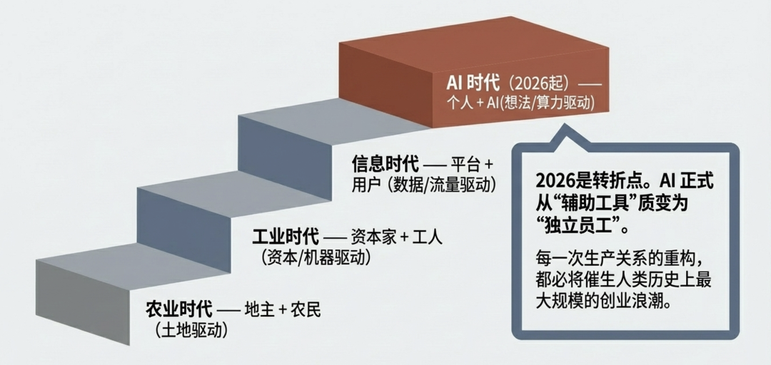 启示四:AI创业窗口期已至,顺势而为才能抓住机遇。2026 年是AI从“工具”变“员工”的转折点,以前AI是辅助,现在能独立干活。这种技术变革,正重构生产关系——从农业时代“地主+农民”、工业时代“资本家+工人”、信息时代“平台+用户”,到AI时代“个人+AI”。每一次生产关系变革,都伴随新的创业浪潮。