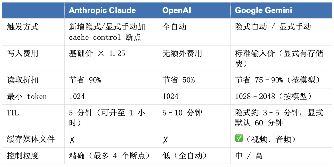 Anthropic Claude 和 Google Gemini 目前均同时支持两种完整模式:既可以通过显式标记 cache_control 断点精确控制缓存位置,也提供自动缓存让系统智能判断。此外,Google Gemini 还额外支持视频、音频等多模态文件缓存,这是其相较于其他平台较为突出的能力。