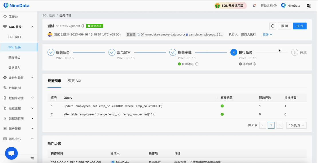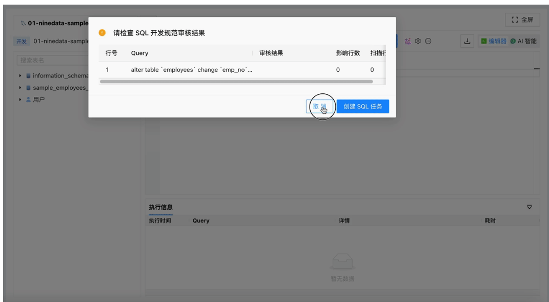 NineData 可以通过规则限制生产库 SQL 窗口中的 DDL / DML,让高风险操作转成 SQL 任务,再经过规范预检和审批流程执行。