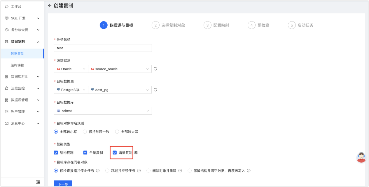 针对 Oracle 到 PostgreSQL 迁移,平台提供多种一致性校验方式,包括全量精准校验、快速校验和增量校验;当发现数据不一致时,还支持修复辅助。这个能力很重要,因为很多迁移项目后续更大的压力,并不是“数据会不会动”,而是“谁也不敢保证目标库是否一致可靠”。有了系统化校验,迁移切换就从经验判断变成了可验证过程。
