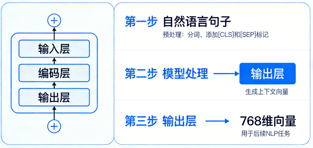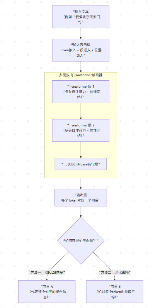 我们可以通过下面这张流程图,清晰地看到从输入一句话到最终获得向量的全过程: