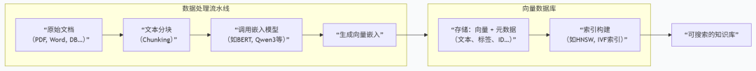 理解了BERT如何生成向量后,创建向量数据库的过程就非常清晰了。这个过程在业界通常被称为 “数据入库”或“索引构建” 。你可以把它想象成一个装配流水线,核心流程如下: