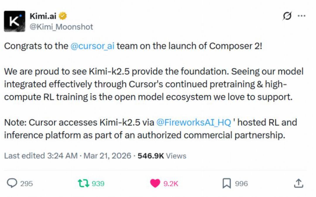 Kimi官方明确表示:“祝贺Cursor团队!我们很自豪看到Kimi K2.5为Composer 2提供了基础。”