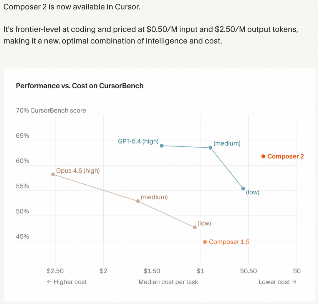 主角是Cursor,这家被资本热捧、估值直逼500亿美元的AI编程独角兽。3月19日,Cursor高调发布了其最新模型Composer 2,宣称其性能碾压Claude,价格却只有对手的一半。一时间,开发者社区为之沸腾,仿佛看到了“自研模型”的奇迹。