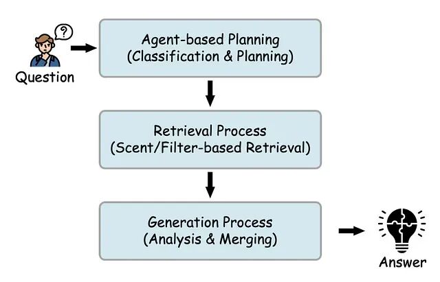 Figure 4: The general workflow of agent-based retrieval in BookRAG, which contains agent-based planning, retrieval, and generation processes.