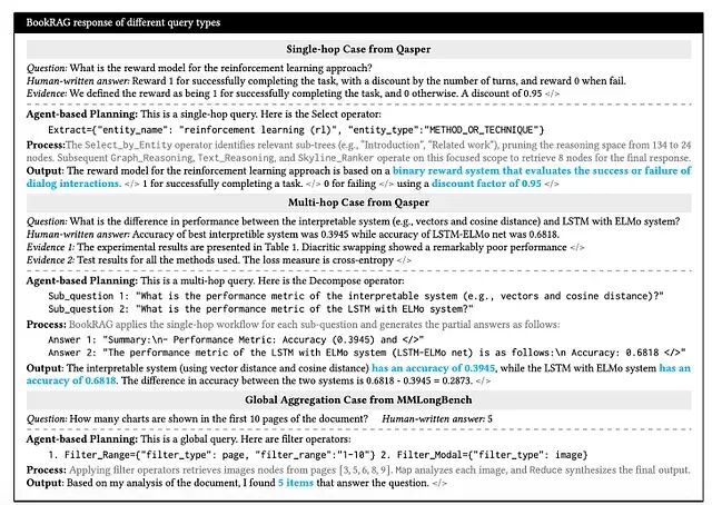 Figure 6: Case study of responses across different query types from MMLongBench and Qasper. CYAN TEXT highlights correct content generated by BookRAG. GRAY TEXT describes the internal process, and marks omitted irrelevant parts.